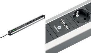 Überspannungsschutz, Netz- und Frequenzfilter, USB Doppel-Charger - Überspannungsschutz - Netz- und Frequenzfilter mit Funktiondisplay und Ausfallanzeige - USB Doppel-Charger 4,75 V–5,25 V; max 2 A - 6 x Schutzkontaktsteckdose, 90° gedreht, schwarz - 15 mm Abstand zwischen den Steckdosen - Wiederanschließbar - Zuleitung 1,75 m H05VV-F 3G 1,5 mm² mit angespritztem Schutzkontakt-Winkelstecker, schwarz - Länge ca. 690 mm