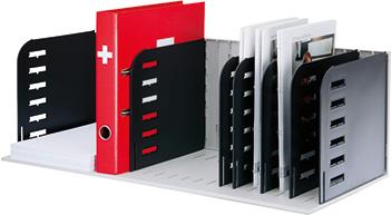 Die geniale Multifunktionsablage verfügt über horizontale und vertikale Fächer. styrorac kann als Stehsammler, Briefablage und als Hängeregistratur eingesetzt werden. Die Einteilung mit stabilen Systemtrennwänden und Tablaren erfolgt individuell. Der vertikale Feinraster von 2,5 cm erlaubt eine optimale Ausnützung der Plattform. Damit lassen sich auch dünne Dossiers, Prospekte und Schnellhefter ohne Durchbiegen ablegen. Für Hängemappen wird ein extra Adapter mitgeliefert, der das Herausrutschen der Mappen verhindert.