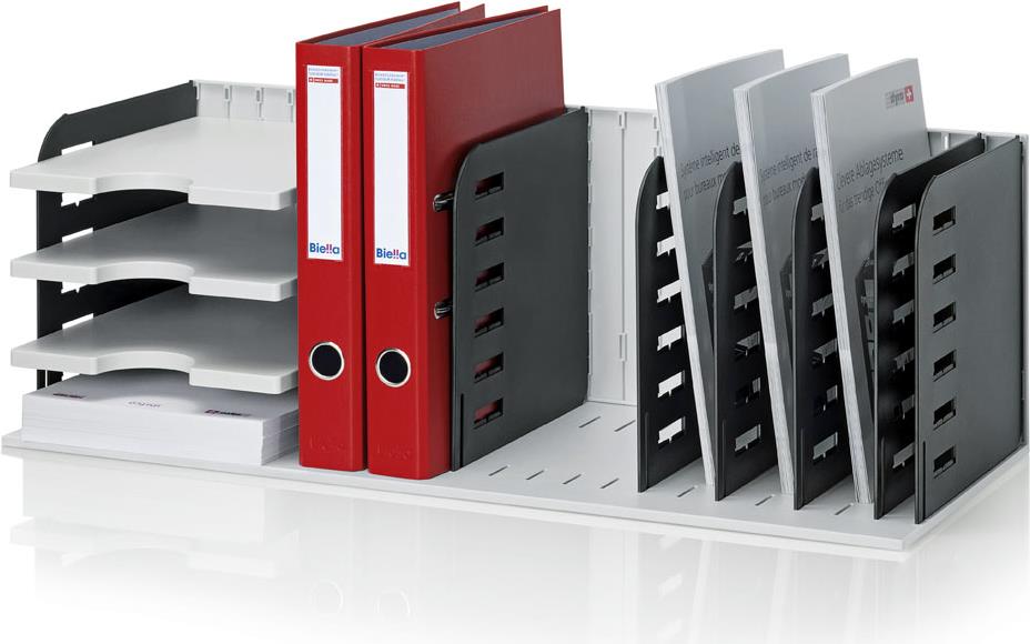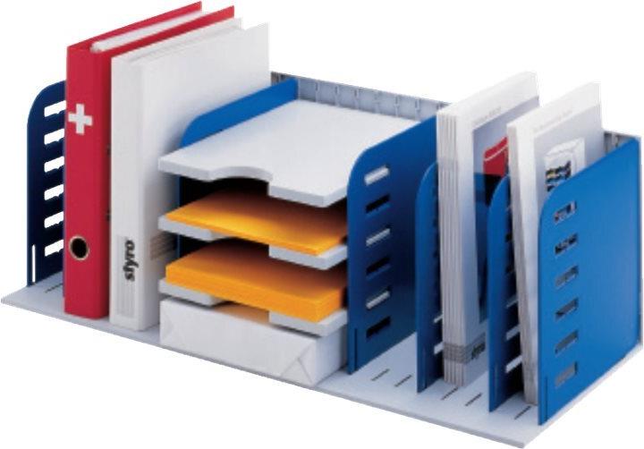 Die geniale Multifunktionsablage verfügt über horizontale und vertikale Fächer. styrorac kann als Stehsammler, Briefablage und als Hängeregistratur eingesetzt werden. Die Einteilung mit stabilen Systemtrennwänden und Tablaren erfolgt individuell. Der vertikale Feinraster von 2,5 cm erlaubt eine optimale Ausnützung der Plattform. Damit lassen sich auch dünne Dossiers, Prospekte und Schnellhefter ohne Durchbiegen ablegen. Für Hängemappen wird ein extra Adapter mitgeliefert, der das Herausrutschen der Mappen verhindert.