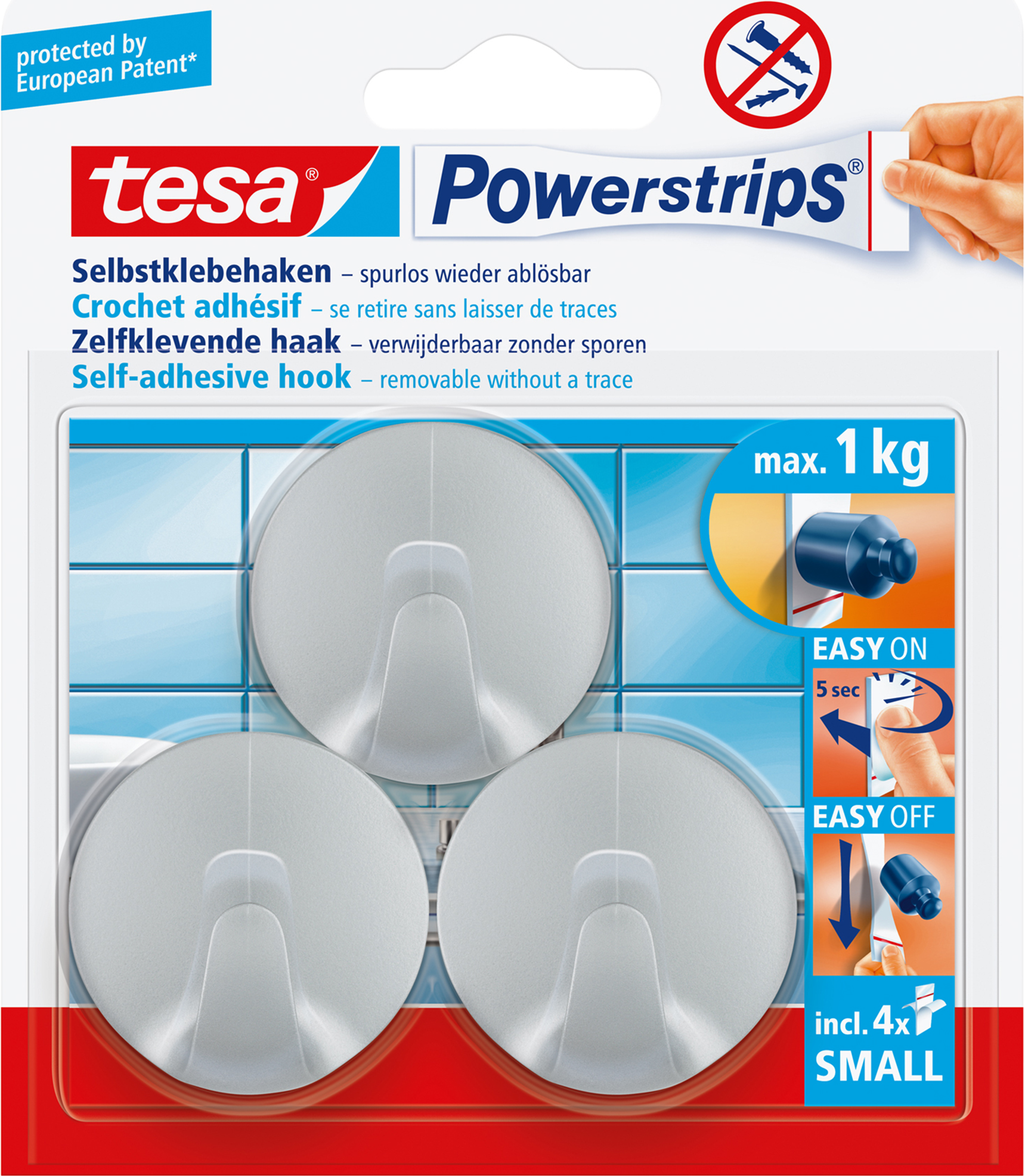 tesa Powerstrip® Haken Small RundMaximaler Halt auf glatten Oberflächen bis zu 1 kg GewichtRückstandfreies AblösenMehrfach verwendbarDie kleineren tesa Powerstrips® Haken Small haben eine maximale Haltekraft bis zu 1 kg. Sie eignen sich für die Verklebung auf Kacheln, Glas, Holz und die meisten Kunststoffe. Die maximale Haltekraft wird auf sauberen, glatten und festen Untergründen erzielt. Technische Daten: Farbe: Chrom (matt)Haltekraft: 1 kgTyp (Hersteller-Typ): 57578-00-03Lieferumfang: 3 Haken und 4 Strips
