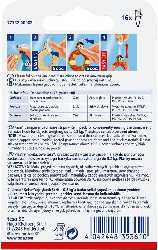 Der transparente Klebestreifen basiert auf der tesa Powerstrips-Technologie und eignet sich in erster Linie zur Wiederverwendung des Klebehakens, kann jedoch auch alleine verwendet werden. Generell ist der Klebestreifen eine clevere Alternative zu anderen Befestigungsmethoden und spielt dank der Transparenz seine Stärken besonders auf Glas, Spiegeln oder Fensterscheiben im Innenbereich aus.