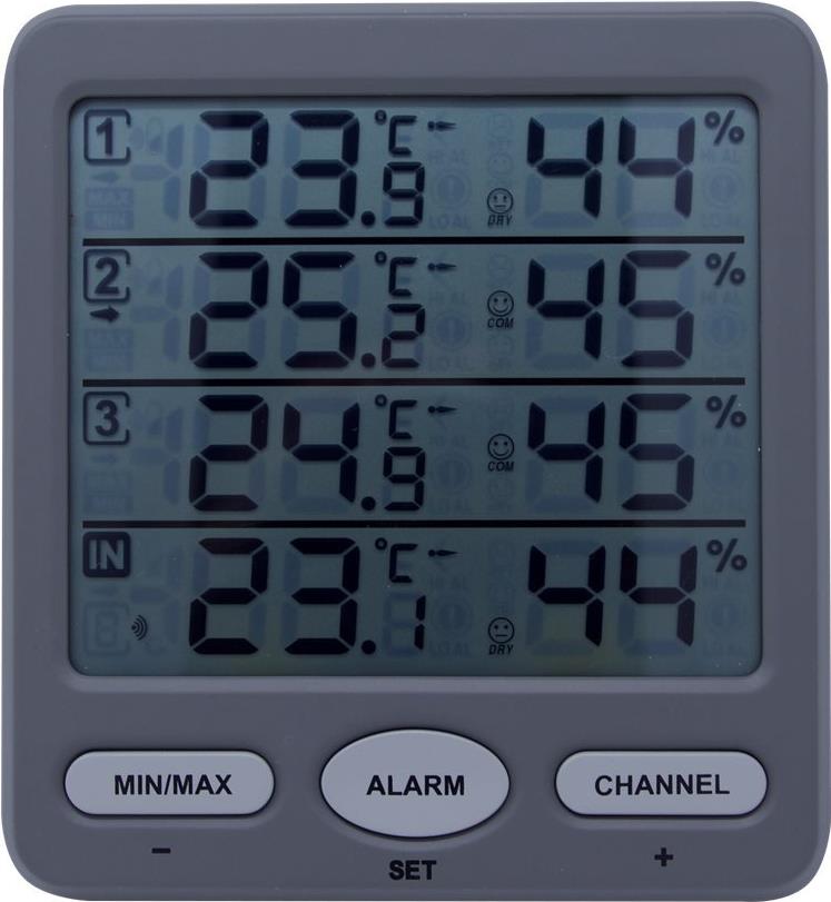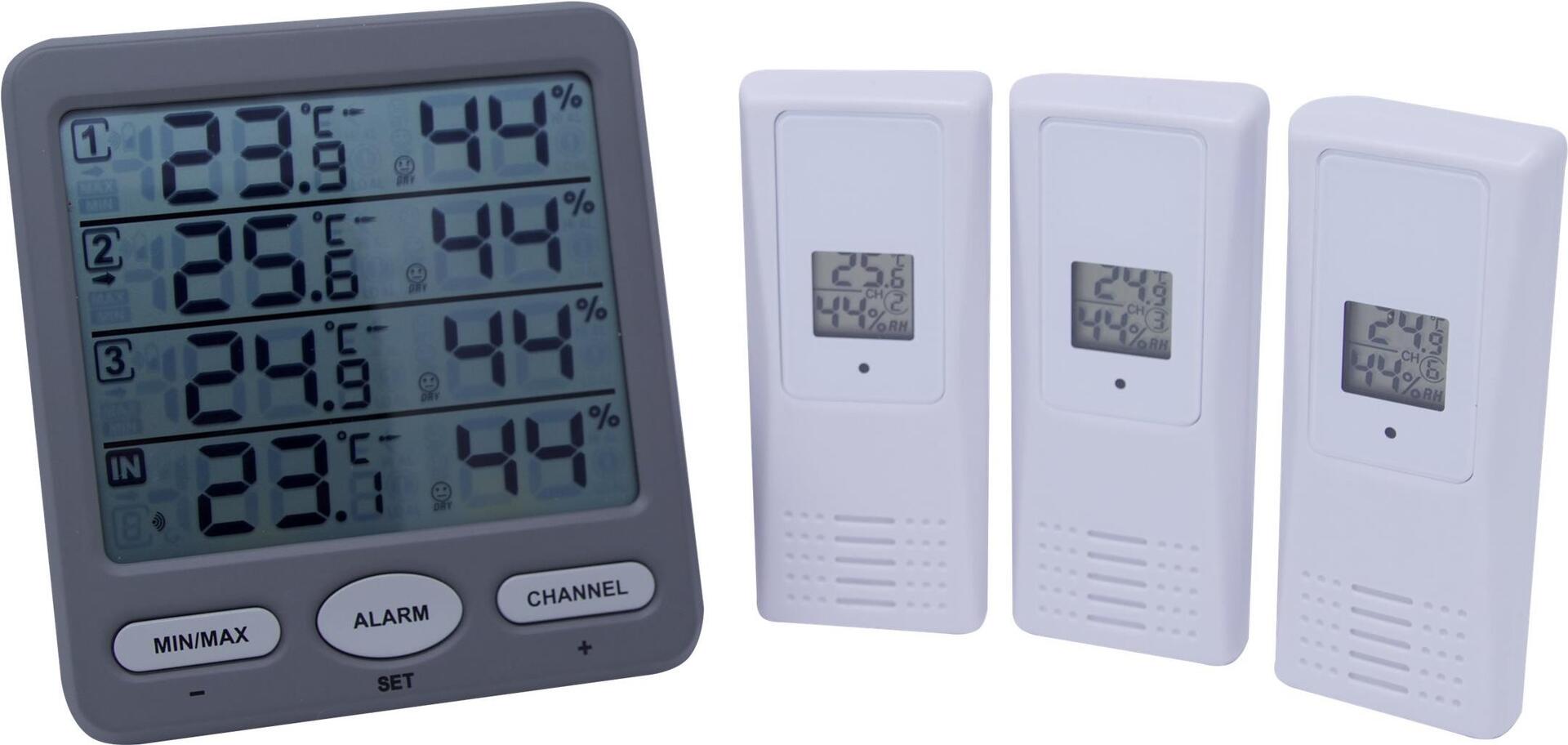 Das digitale Funk-ThermoHygrometer KLIMA-MONITOR ermöglicht die gleichzeitige Überwachung des Raumklimas in bis zu vier Räumen. Mit den drei mitgelieferten Funksendern lassen sich Temperatur und Luftfeuchtigkeit außer am Aufstellort noch in weiteren Räumen (Schlafzimmer, Kinderzimmer, Keller, Wintergarten...) oder im Außenbereich messen. Für alle Messpunkte sind Alarmwerte einstellbar. Ein Komfort-Indikator gibt an, ob die Werte aktuell zu trocken, zu feucht oder im optimalen Bereich liegen. Durch gezieltes Heizen und Lüften schaffen Sie sich ein angenehmes und gesundes Wohnklima und sparen sogar Heizkosten.