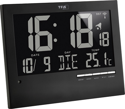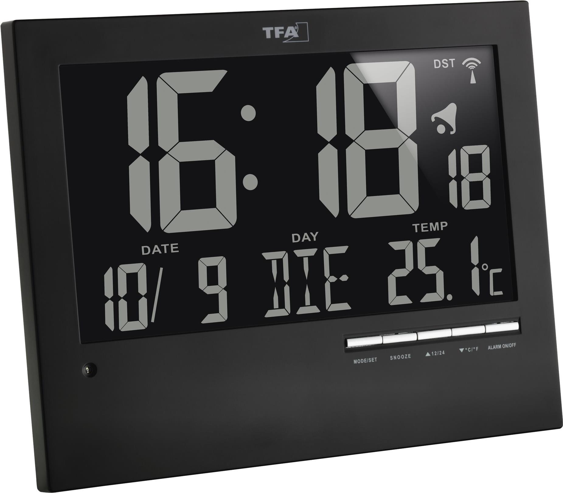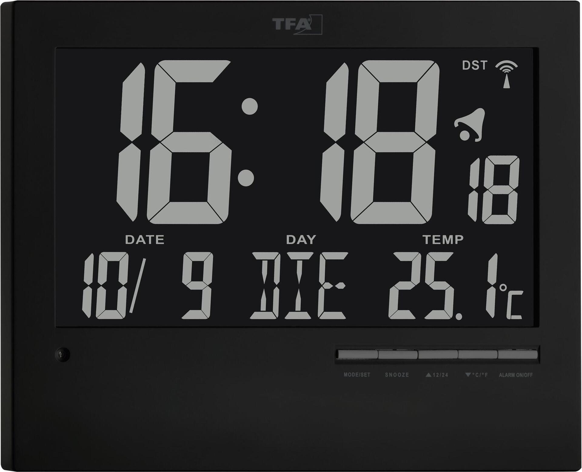 Das Besondere an dieser modernen Funkwanduhr von TFA mit großem, invertiertem Display ist die automatische Hintergrundbeleuchtung mit Tag-Nacht-Modus. Der eingebaute Lichtsensor registriert, wenn das Tageslicht nicht mehr ausreicht und aktiviert auf Wunsch eine dezente Beleuchtung. So ist das Display auch bei Dunkelheit gut ablesbar. Kommt ein Netzadapter zum Einsatz (nicht mitgeliefert), kann die Anzeige auch dauerhaft beleuchtet werden. Neben der Uhrzeit werden Ihnen auch Datum und Wochentag angezeigt. Das integrierte Thermometer misst die Innentemperatur und sorgt so für ein angenehmes Klima in Ihren Wohnräumen. Die Uhrzeit wird über das DCF77 Signal auf die Sekunde genau eingestellt und auch der Wechsel von Winter- auf Sommerzeit erfolgt automatisch. Das schlichte und klare Design passt in jede Umgebung, gleichgültig, ob Sie die Funkuhr aufhängen oder hinstellen möchten.