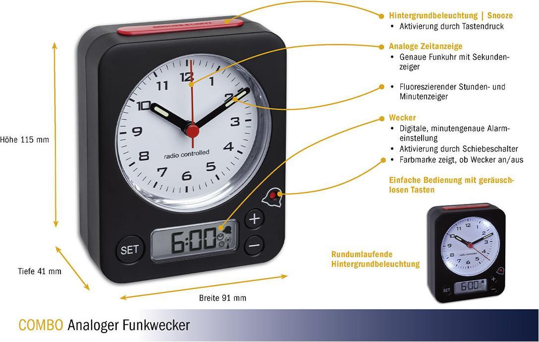 Sie mögen lieber einen Wecker mit klassischem Zifferblatt, würden aber trotzdem gerne auf die Minute genau pünktlich geweckt werden? Dann ist der Funk-Wecker COMBO von TFA perfekt für Sie.
