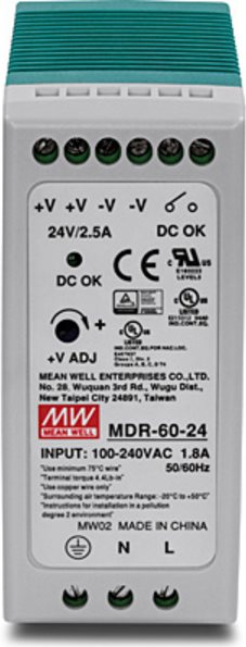 Das TI-M6024 liefert bis zu 60 Watt Leistung für industrielle PoE-Geräte wie Switches, Netzwerkkameras und Wi-Fi Access Points. Dieses nach IP30 eingestufte Netzteil verfügt über aktive PFC, eine integrierte DIN-Schienenbefestigung und einen Überlaststromschutz.