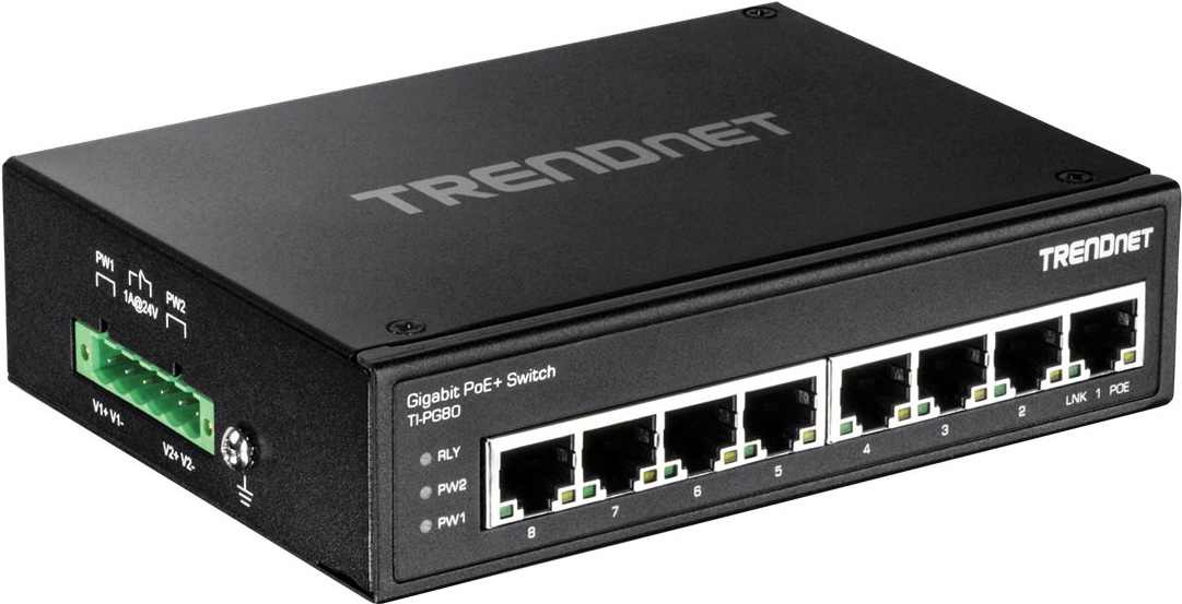 Der TI-PG80 von TRENDnet ist ein zuverlässiger IP30 Unmanaged PoE+ DIN-Rail-Switch mit gehärteten Komponenten, die für extreme industrielle Umgebungen ausgelegt sind. Er bietet 8 Gigabit-PoE+-Ports und ein PoE-Leistungsbudget von bis zu 200 Watt. Zwei redundante Stromeingänge und ein Alarmausgang bei Stromausfall unterstützen Anwendungen ohne Ausfallzeiten.