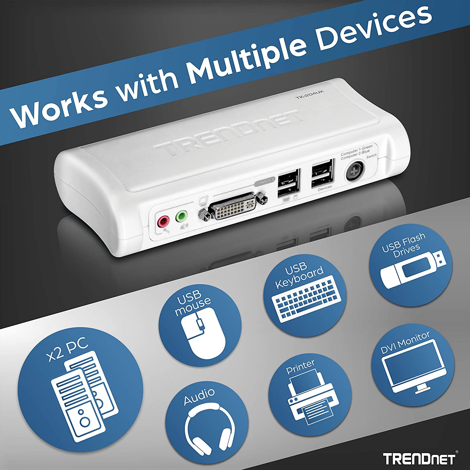 Der DVI-USB-KVM-Switch mit 2 Anschlüssen und Audio-Kit ermöglicht Ihnen die Steuerung von 2 Computern über eine einzige Konsole mit hochauflösender DVI-Technologie (Digital Video Image). Verwalten Sie 2 Computer mit DVI- und USB-Anschlüssen auf Knopfdruck mit einem Set aus USB-Tastatur, USB-Maus, DVI-Monitor, Mikrofon und Lautsprechern. Genießen Sie Bilder in DVI-Qualität von beiden Computern. Sie brauchen keine zusätzlichen Kabel, alle erforderlichen Kabel sind im Lieferumfang enthalten. Hören Sie Musik auf einem Computer, während Sie auf dem anderen arbeiten. Mit Hot-Plug-, Auto-Scan- und Hot-Key-Funktionen ist dieses vielseitige Gerät die perfekte Wahl für die Verwaltung von 2 Computern.