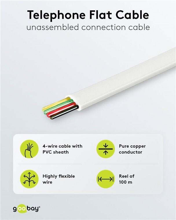 Wentronic Goobay Telefonflachkabel 100 m Rolle,AWG 28,CCA (kupferkaschiertes Aluminium), Weiß (93305)