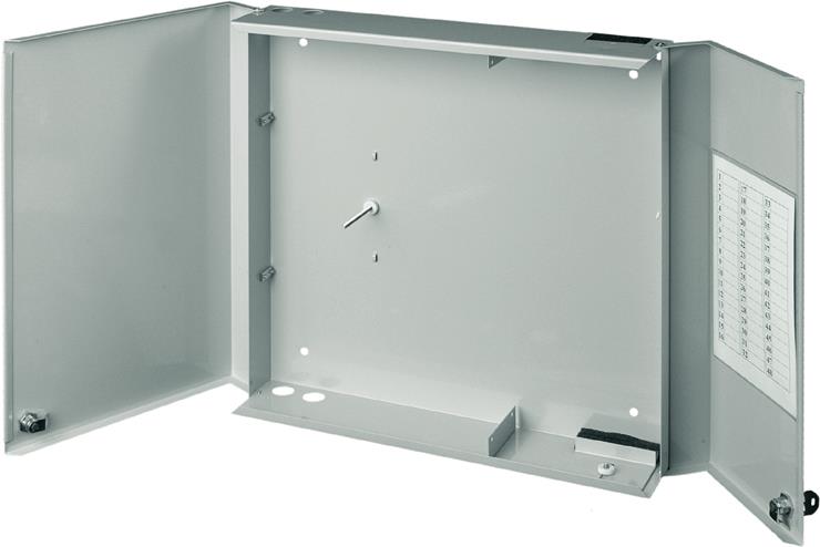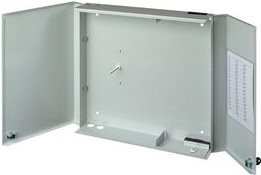 Der LWL-Mini-Wandverteiler hat ein getrennt abschließbares Gehäuse mit 2 Schwenktüren, mit je 2 Kabeleinführungsöffnungen oben und unten für PG16, Aufnahme für maximal 6 Spleiß- oder Kombikassetten, Zugentlastungsklemmen und Führungen zur Faser- und Kabelablage.