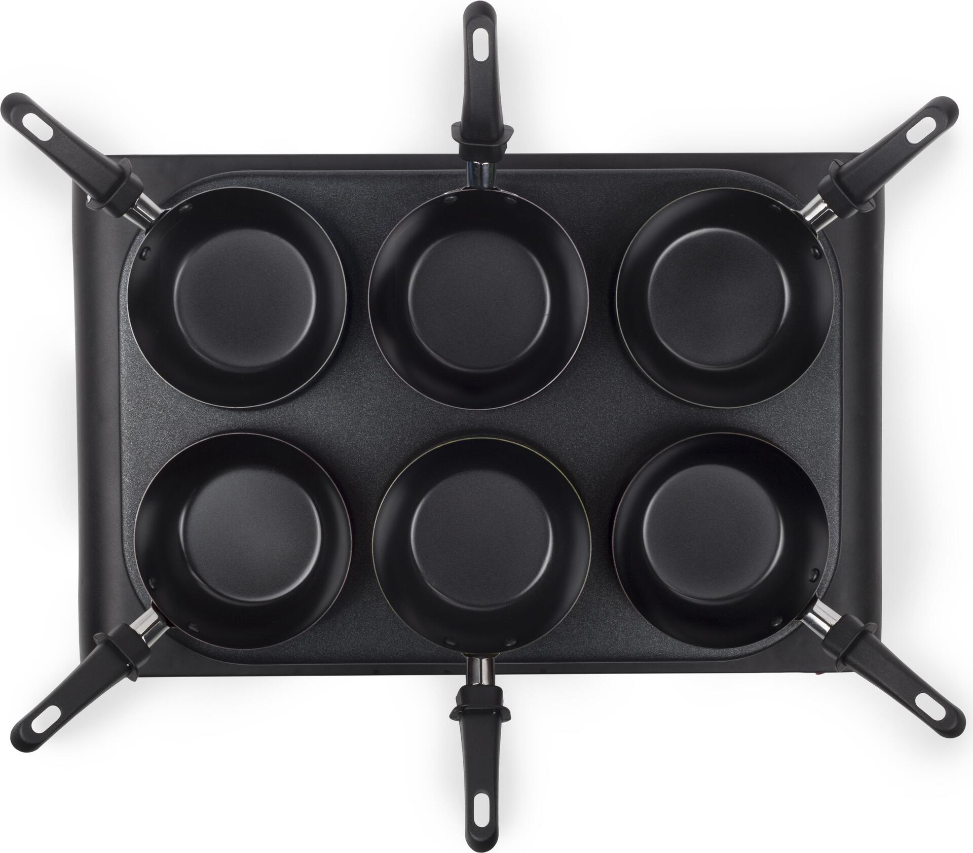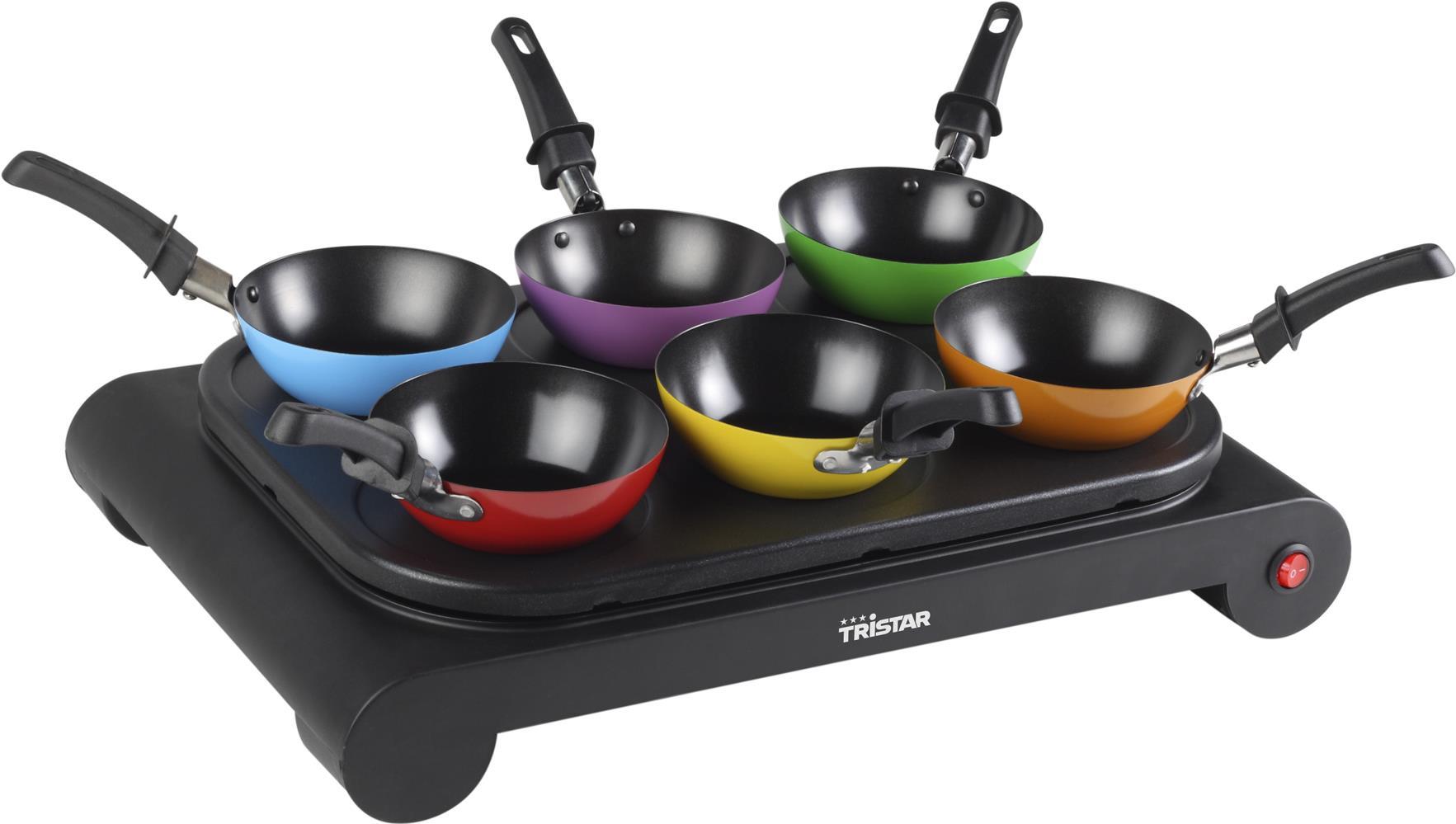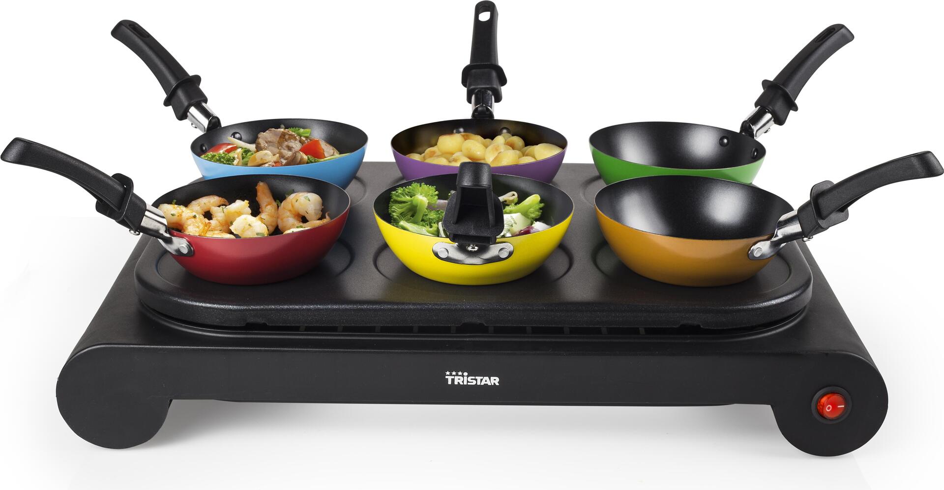 Dieses 6 -Personen Wokset mit trendigen farbigen Pfännchen ist perfekt für einen gemütlichen Abend mit Freunden oder Familie geeignet. In der Backplatte sind praktische Formen für das Backen von Pfannkuchen integriert.