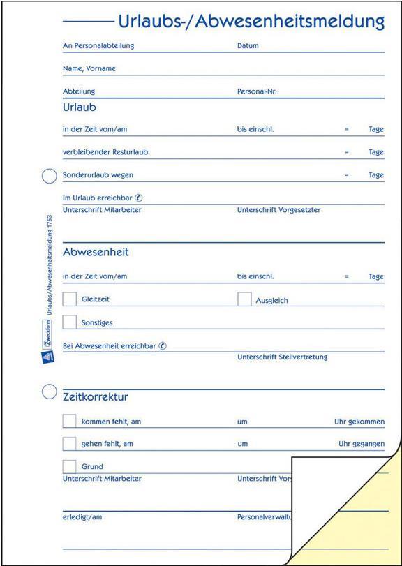 Die Abwesenheitsmeldung von Avery Zweckform eignet sich ideal für die Zeiterfassung in der Personalverwaltung. Es kann als Abwesenheitsmeldung oder Urlaubsmeldung eingesetzt werden. Durch das selbstdurchschreibende Papier ist der Durchschlag gleich zur Hand.