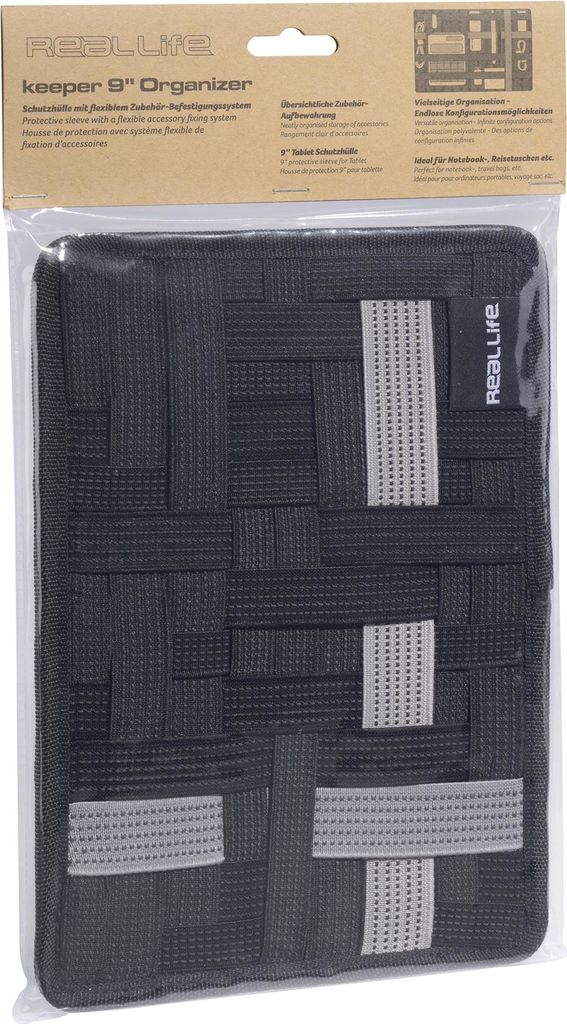 Der RealLife keeper Organizer ist eine flexible Lösung zur übersichtlichen Aufbewahrung von Zubehör, Werkzeugen usw. und dient gleichzeitig als Schutzhülle für Tablets. Dank der gummierten elastischen Bänder kann Zubehör oder Werkzeug sicher und übersichtlich befestigt und transportiert werden.