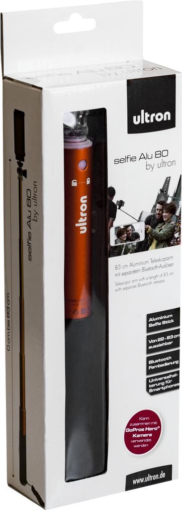 Der ultron selfie Alu 80 punktet mit Flexibilität und Bedienkomfort. Im Lieferumfang ist eine Bluetooth- Fernbedienung enthalten, die als Auslöser für die gekoppelte Kamera dient. Verwackelte Bilder gehören so der Vergangenheit an. Hat der Nutzer einmal nicht beide Hände zur Verfügung, kann die Fernbedienung mittels mitgeliefertem Clip am Selfie-Stick befestigt werden und so auch nicht verloren gehen. Der ultron selfie Alu 80 besteht aus Aluminium und lässt sich von 22 - 83 cm ausziehen.