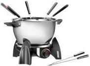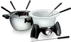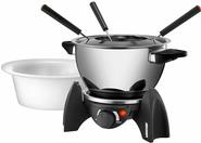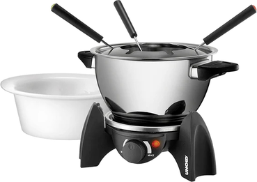 Alles in einem: Fleisch-Fondue, Käse-Fondue und Schoko-Fondue. Geht nicht? Geht doch – mit dem FONDUE-SET von UNOLD. Neben dem Edelstahl-Topf für das klassische Fleisch-Fondue gibt es jetzt noch einen obendrauf: Den formschönen, unverwüstlichen Keramiktopf, in dem Schokolade oder Käse super-sanft geschmolzen werden können. Nichts kann anbrennen, dank einem stufenlos regulierbaren Temperaturregler mit Kontrollleuchte. Und damit es der Tischplatte nicht zu heiß wird, steht das FONDUE-SET auf speziellen Cool-Touch-Füßen. Einen Spritzschutz aus Edelstahl mit Gabelhalterung macht die Sache perfekt.