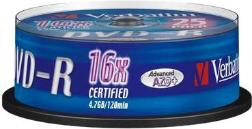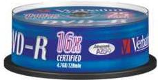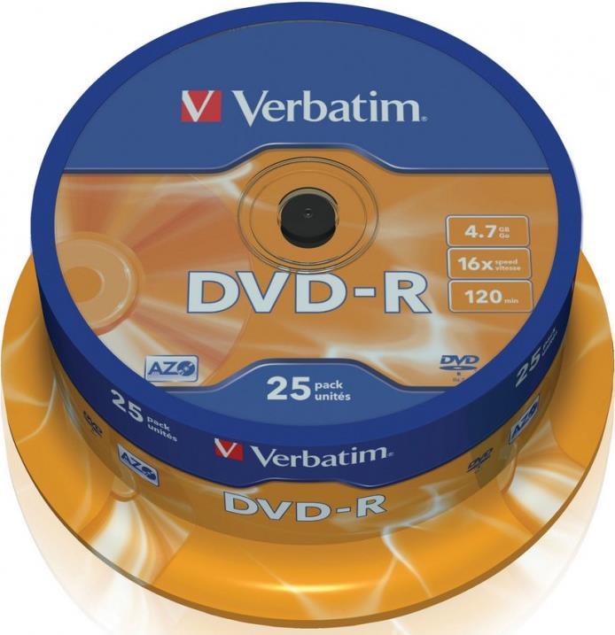 Produkttext[/head]Beim DVDR/RW-Sortiment von Verbatim kommt unsere bewährte MKM/Verbatim-Technologie zum Einsatz, dank derer jede Aufnahme qualitativ hochwertig ist. Dank der Forschungs- und Entwicklungsarbeit bei Mitsubishi Chemical und in enger Zusammenarbeit mit Laufwerksherstellern kann die weitreichende Kompatibilität der Verbatim-Disks sichergestellt werden. Dies macht sie ideal für den Austausch von Computerdaten, Privatvideos, Fotos und Musik. Von Europas Nummer 1* für beschreibbare MedienDVD-R ist eine beschreibbare Disk mit 4,7 GB Speicherkapazität. Erfüllt die DVD-Forum-Spezifikationen.AZO-AufnahmeschichtHöchstes Maß an AufnahmestabilitätSehr hohe ArchivlebensdauerDiese Disk hat eine matte silberfarbene Oberfläche. Beschreibbar mit einem CD/DVD-Marker.[head]Hauptmerkmale