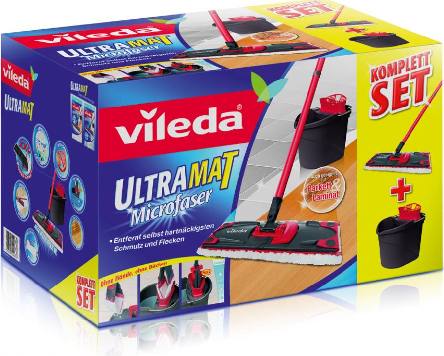 Das praktische UltraMat Komplett-Set von Vileda besteht aus einem UltraMat Wischer mit Microfaserbezug und dreiteiligem Stiel sowie einem UltraMat Eimer mit PowerPresse. Die hochwertige 3D-Microfaserstruktur des Wischbezugs beseitigt selbst hartnäckigste Verschmutzungen auf Ihren Böden problemlos und ermöglicht ein optimales Gleiten über den Boden. Für einen kraftvollen Kontakt mit dem Untergrund und eine bessere Beseitigung von Flecken sorgt die einzigartige Noppenstruktur auf der Unterseite der Wischerplatte - ganz ohne Ihren Rücken zu beanspruchen.