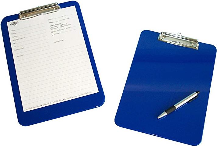 WEDO Klemmbrett A4 blau. Stabiles Klemmbrett mit abgerundeten Ecken aus bruchsicherem ABS-Kunststoff. Die Metallklemme ist vernickelt und hat zusätzlich eine Öse zum Aufhängen.