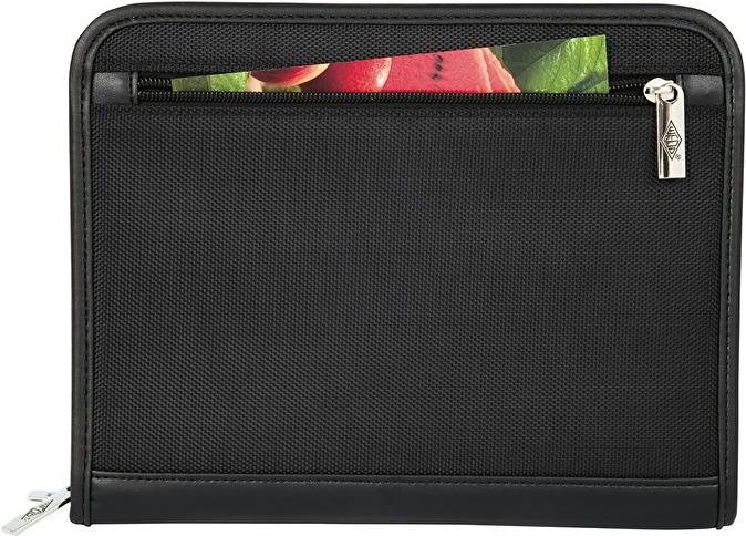 Die Mappe wird mit einem Reißverschluss verschlossen und ist außen mit einem weiteren Reißverschlussfach und einer Einstecktasche mit Klettverschluss ausgestattet.
