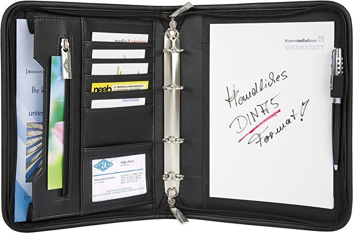 WEDO Konferenzmappe Elegance für DIN A5 Formate. Die kompakte, handliche Mappe ist mit einer 4 Ringmechanik (Ø 30 mm, Füllhöhe 22 mm), einem Einsteckfach für einen A5 Schreibblock und einer Gummizugschlaufe für ein Schreibgerät ausgestattet. Sie verfügt darüber hinaus über fünf Kartenfächer, ein Sichtfenster für Visitenkarten, ein Reißverschlussfach sowie ein A5 Faltfach.