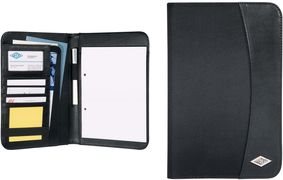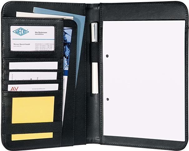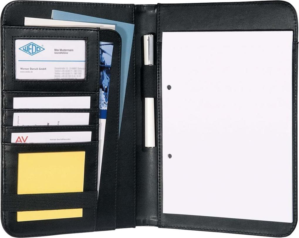 WEDO Schreibmappe "Elegance" für DIN A5-Formate. Handlich klein mit praktischer Innenaufteilung: Neben einem Einsteckfach für einen A5-Schreibblock und eine Gummizugschlaufe für ein Schreibgerät ist die Schreibmappe mit zwei Einsteckfächern für A5-Formate, vier Kartenfächern, einem Sichtfenster für Visitenkarten sowie einer großen Gummizugschlaufe für einen Taschenrechner o.ä. ausgestattet. Die außergewöhnliche Kombination von hochwertigem Kunstleder und strukturiertem Nylon gibt dieser Schreibmappe aus der Elegance"-Taschenserie eine moderne und elegante Optik.