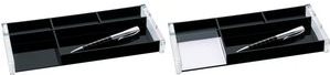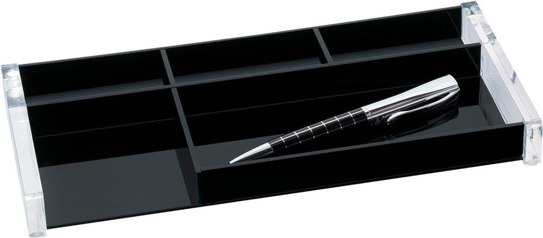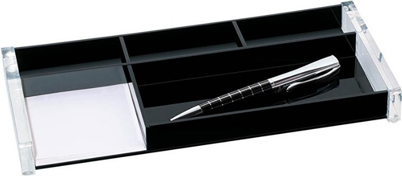 Glasklares Acryl kombiniert mit tiefem Schwarz und das innovative Design verleihen diesen Accessoires eine kühle Eleganz mit außergewöhnlicher Optik. Neben einem großen Stiftfach bietet die Stiftschale mit einem Fach für Haftnotizblocks (76 x 76 mm) und drei Sammelfächern viel Platz für weitere Utensilien.