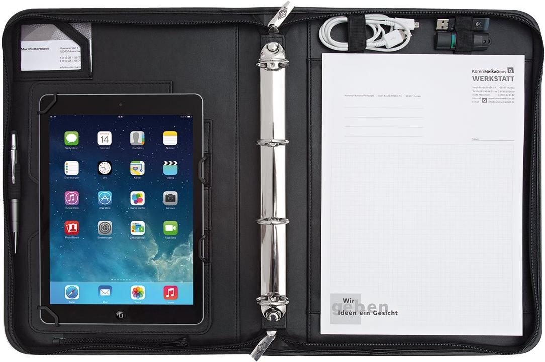 Die neuen Tablet-Organizer passen sich markenunabhängig den unterschiedlichsten Tablet-Modellen an. Der flexible Halterungsmechanismus fixiert durch je zwei feste und flexible Gummizugbügel alle Tablets mit einer Länge von 24,0 - 26,6 cm und einer Breite von 17,0 - 18,6 cm sicher und fest. Die praktische, multifunktionale Ausstattung mit herausnehmbarer 4-Ring-Mechanik bietet zusätzlich Platz für einen A4-Schreibblock, Zubehör, Stift und Karten. Modern, elegante Optik durch hochwertiges Kunstleder kombiniert mit strukturiertem Nylon.