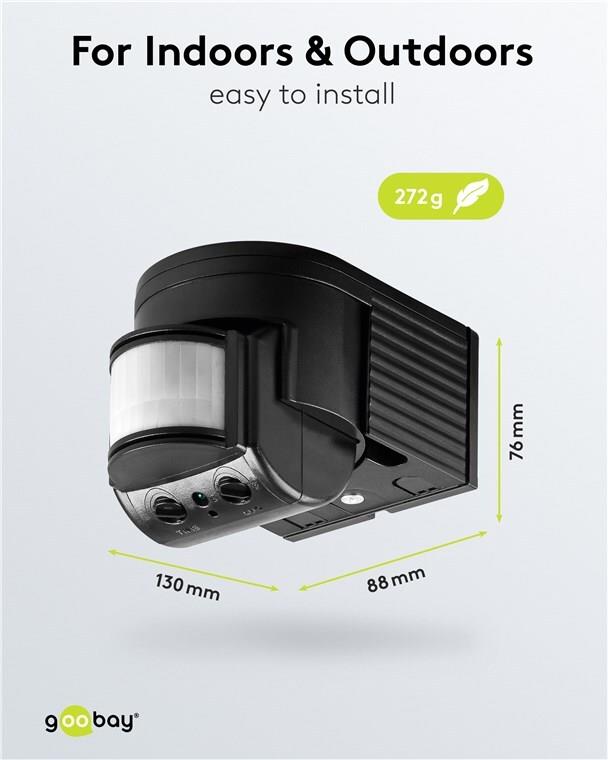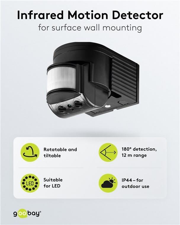 Wentronic Goobay Infrarot Bewegungsmelder, Schwarz - zur Aufputz-Wandmontage, 180 ° Erfassung, 12 m Reichweite, für Innen (IP44), LED-geeignet (96001)