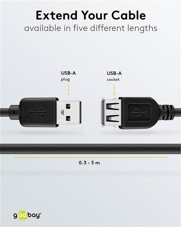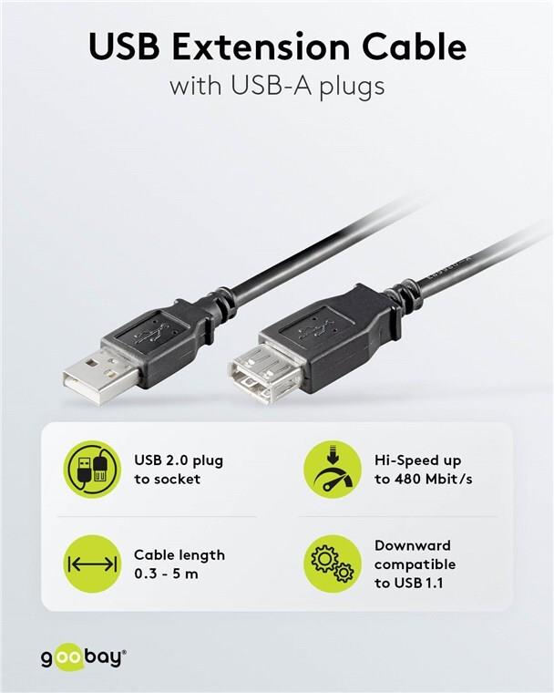 • Wentronic Goobay USB 2.0 Hi-Speed Verlängerungskabel, Schwarz, 1.8 m - USB 2.0-Stecker (Typ A) > USB 2.0-Buchse (Typ A) (68903)
