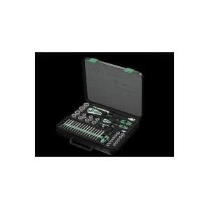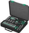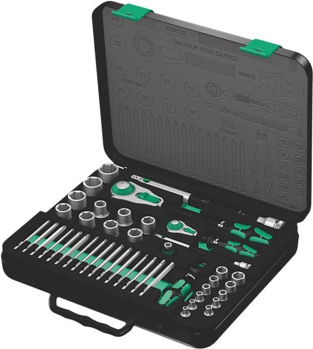 43tlg. 8100 SA/SC 2 Zyklop-Kn. 1/4\"\"+1/2\"\"Zyklop „6" 1“Die Wera Zyklop-Knarre vereinigt 5 Knarrentypen in einer Knarre - zusätzlich ist sie als Schraubendreher einsetzbar:1. Feinzahnknarre2. Gelenkknarre3. Abgewinkelte Knarre4. Knarre mit Nussverriegelung5. Kraftknarre6. SchraubendreherDie Zyklop-Knarren sind echte Schnelldreher: Die Schwungmassen-Konstruktion sorgt für die Beschleunigung des Schraubprozesses. Der rotationssymmetrische Aufbau des Kraftform-Griffs und die Freilaufhülse unterstützen das rasante Zwirbeln. Insbesondere dann, wenn durch ein zu leichtgängiges Gewinde die Knarre noch nicht greift.Die mit 72 Zähnen feinverzahnten Umschaltknarren haben einen niedrigen Rückschwenkwinkel von nur 5°. Der kleine Hub ermöglicht schnelles und präzises Arbeiten in allen Einbaulagen.Die Kugelarretierung sorgt für sicheren Sitz der Nüsse und des Zubehörs und damit auch für verlässliche Sicherheit während des Verschraubens. Ein kurzer Druck auf den Auslöseknopf und der Wechsel ist in allen definierten Stellungen rt. Selbst in der 90°-Position ist die Betätigung gewährleistet.Der Knarrenkopf ist frei schwenkbar und kann durch den beidseitig angebrachten Schiebeschalter in jeder Position verriegelt werden. Problemloses Arbeiten mit großem Handfreiraum ist selbst in sehr engen oder schwer zu erreichenden Einbausituationen möglich. Die definierte Fixierung bei 0°, 15° und 90° nach links und rechts rt sicheres Arbeiten ohne Verrutschen des Knarrenkopfes.Alle Zyklop-Knarren sind über das Rändelrad in jeder Position schnell und leicht für Rechts-/Linksgang umschaltbar. Keine umständliche Handhabung, kein Zeitverlust!In der 0° Position sind die Knarren mit Adapter und Bit wie ein herkömmlicher Schraubendreher einsetzbar.Der Knarrenkopf ist ergonomisch gestaltet die Fingermulden bieten perfekt geformte Anlageflächen für Hand oder Finger zum Drehen des Kopfes. Durch die hervorragend an die Hand angepasste Form des Kraftform-Griffs werden Handverletzungen wie Blasen und Schwielen vermieden. Die für den Griff verwendeten harten Materialien ren schnelles Umgreifen ohne die Gefahr des „Festklebens“ der Haut am Griff. Die weicheren, „rutschfesten“ Zonen ermöglichen die verlustfreie Übertragung hoher Kräfte. Die runde Griffform erlaubt schnelles Zwirbeln in der 0° Stellung.Die Freilaufhülse der Verlängerung beschleunigt das Drehen von Schrauben und Muttern wirkungsvoll. Die sogenannten Hand- und Maschinen-Nüsse (ISO 2725-Teil 3) ermöglichen einen Einsatz im Hand- und Maschinenbetrieb. Der Anwender ist mit nur einem Nuss-Sortiment für alle Anwendungen gerüstet.Die Zyklop-Knarrenboxen sind in einem ansprechenden Design entwickelt - aus solidem Metall und mit rutschsicheren Gummifüßen. Die Werkzeuge werden durch die Schaumstoffeinlage während des Transports und am Arbeitsplatz sicher und rüttelfrei gehalten. Die Schaumstoffeinlage kann bei Bedarf auch entnommen werden. Die Bestückung und Position des Werkzeugs ist in der Deckeleinlage gut sichtbar und dauerhaft eingelasert.Ausstattung: Zyklop „6" 1“Die Wera Zyklop-Knarre vereinigt 5 Knarrentypen in einer Knarre - zusätzlich ist sie als Schraubendreher einsetzbar:1. Feinzahnknarre2. Gelenkknarre3. Abgewinkelte Knarre4. Knarre mit Nussverriegelung5. Kraftknarre6. SchraubendreherDie Zyklop-Knarren sind echte Schnelldreher: Die Schwungmassen-Konstruktion sorgt für die Beschleunigung des Schraubprozesses. Der rotationssymmetrische Aufbau des Kraftform-Griffs und die Freilaufhülse unterstützen das rasante Zwirbeln. Insbesondere dann, wenn durch ein zu leichtgängiges Gewinde die Knarre noch nicht greift.Die mit 72 Zähnen feinverzahnten Umschaltknarren haben einen niedrigen Rückschwenkwinkel von nur 5°. Der kleine Hub ermöglicht schnelles und präzises Arbeiten in allen Einbaulagen.Die Kugelarretierung sorgt für sicheren Sitz der Nüsse und des Zubehörs und damit auch für verlässliche Sicherheit während des Verschraubens. Ein kurzer Druck auf den Auslöseknopf und der Wechsel ist in allen definierten Stellungen rt. Selbst in der 90°-Position ist die Betätigung gewährleistet.Der Knarrenkopf ist frei schwenkbar und kann durch den beidseitig angebrachten Schiebeschalter in jeder Position verriegelt werden. Problemloses Arbeiten mit großem Handfreiraum ist selbst in sehr engen oder schwer zu erreichenden Einbausituationen möglich. Die definierte Fixierung bei 0°, 15° und 90° nach links und rechts rt sicheres Arbeiten ohne Verrutschen des Knarrenkopfes.Alle Zyklop-Knarren sind über das Rändelrad in jeder Position schnell und leicht für Rechts-/Linksgang umschaltbar. Keine umständliche Handhabung, kein Zeitverlust!In der 0° Position sind die Knarren mit Adapter und Bit wie ein herkömmlicher Schraubendreher einsetzbar.Der Knarrenkopf ist ergonomisch gestaltet die Fingermulden bieten perfekt geformte Anlageflächen für Hand oder Finger zum Drehen des Kopfes. Durch die hervorragend an die Hand angepasste Form des Kraftform-Griffs werden Handverletzungen wie Blasen und Schwielen vermieden. Die für den Griff verwendeten harten Materialien ren schnelles Umgreifen ohne die Gefahr des „Festklebens“ der Haut am Griff. Die weicheren, „rutschfesten“ Zonen ermöglichen die verlustfreie Übertragung hoher Kräfte. Die runde Griffform erlaubt schnelles Zwirbeln in der 0° Stellung.Die Freilaufhülse der Verlängerung beschleunigt das Drehen von Schrauben und Muttern wirkungsvoll. Die sogenannten Hand- und Maschinen-Nüsse (ISO 2725-Teil 3) ermöglichen einen Einsatz im Hand- und Maschinenbetrieb. Der Anwender ist mit nur einem Nuss-Sortiment für alle Anwendungen gerüstet.Die Zyklop-Knarrenboxen sind in einem ansprechenden Design entwickelt - aus solidem Metall und mit rutschsicheren Gummifüßen. Die Werkzeuge werden durch die Schaumstoffeinlage während des Transports und am Arbeitsplatz sicher und rüttelfrei gehalten. Die Schaumstoffeinlage kann bei Bedarf auch entnommen werd