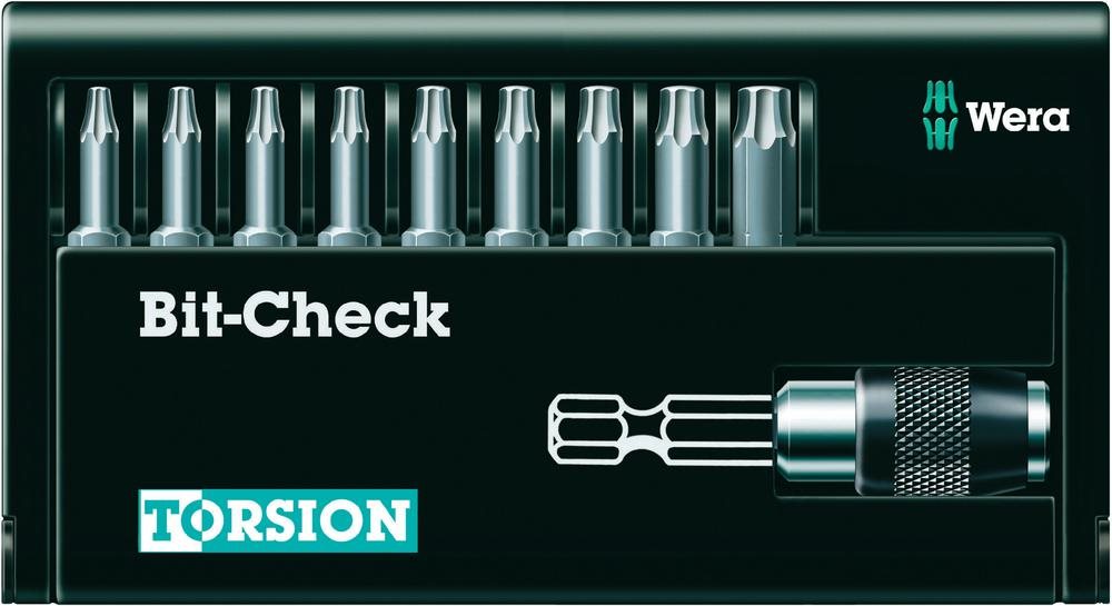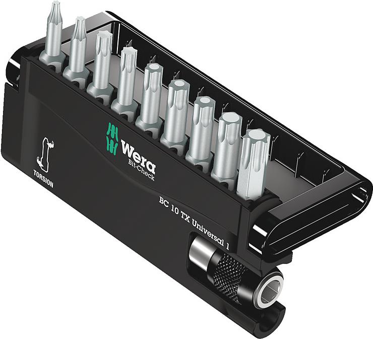 8167/9/TZ Bit-Check Bits-SortimentBit-Check aus robustem Kunststoff für lange Lebensdauer. Einfacher Transport z.B. in der Hemdtasche. Einhändige Bit-Entnahme. Bits mit Torsionszone gegen vorzeitigen Bit-Bruch.Ausstattung: Zähharte Bits, besonders geeignet für die in Blech oder Metall. Verhindert vorzeitigen Bruch der Abtriebsspitze. Universalhalter mit Schnellwechselfutter.Technische Daten: Abtrieb: TORXAntrieb (Schraubendreher): 1/4\"\" (6.3 mm)Bit-Typ (Kategorisierung): Bit-SetBits-Besonderheiten: TorsionszoneForm (Bits): D 6.3Material (LOV): WerkzeugstahlMaterial-Eigenschaft: legiert, zähhartProduktabmessung, Länge: 25 mmLieferumfang: 1 Universalhalter mit Schnellwechselfutter. Jeweils 1 Bit TX 8x25 mm / TX 9x25 mm / TX 10x25 mm / TX 15x25 mm / TX 20x25 mm / TX 25x25 mm / TX 27x25 mm / TX 30x25 mm / TX 40x25 mm.