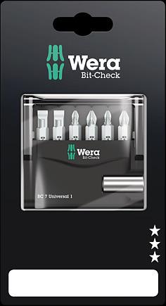 6 Wera Bits übersichtlich angeordnet auf engstem Raum im praktischen Bit-Check. Zähharte Wera Bits für Innensechskantschrauben, für den universellen Einsatz. 1 Universalhalter 893/4/1 K zur Aufnahme in die Schraubermaschine oder zum Einsatz in das Bohrfutter der elektronischen Bohrmaschine.