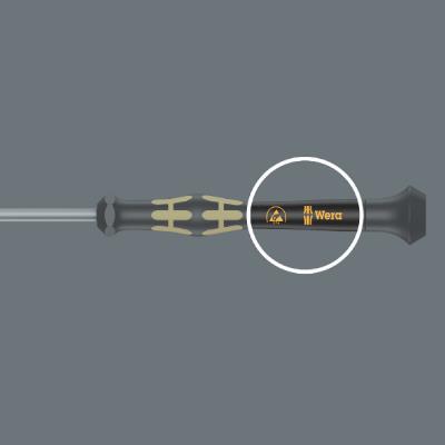 Elektrostatisch abgesicherter Wera Micro Schraubendreher. Sicherer Schutz vor elektrostatischer Energie und damit verbundenen Schäden. Durch Abstützen der Hand auf der ...