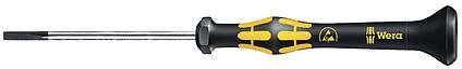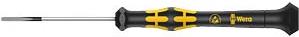 1578 A ESD 0,40 x 2,5 x 80 mm Micro-S.D.Elektrostatisch abgesicherter Wera Micro Schraubendreher. Sicherer Schutz vor elektrostatischer Energie und damit verbundenen Schäden. Durch Abstützen der Hand auf der Drehkappe und durch die Schnelldrehzone unterhalb der Drehkappe ist blitzschnelles Zwirbeln möglich. Zeitintensives Umgreifen entfällt. Kraftzone mit integrierten Weichzonen sorgt für die Übertragung hoher Löse- und Anzugsmomente. Präzisionszone für den richtigen Drehwinkel bei Justierarbeiten.Ausstattung: Elektrostatisch abgesicherter Wera Schraubendreher. Sicherer Schutz vor elektrostatischer Energie und damit verbundenen Schäden. Deutliche Reduktion der szeiten in Elektronik und Feinmechanik. Senkung der Kosten pro .Genaues, kraftvolles, schnelles und ergonomisch richtiges Verschrauben durch das Drei-Zonen-Konzept mit Präzisions-, Kraft- und Schnelldrehzone.Dank der drehbaren Kappe und der Schnelldrehzone ist blitzschnelles Zwirbeln möglich. Zeitintensives Umgreifen entfällt. Die Kraftzone sorgt für die Übertragung hoher Löse- und Anzugsmomente, ohne dass der Kontakt zur Schraube verlorengeht. Die Präzisionszone direkt über der Klinge gibt dem Anwender ein gutes Gefühl für den richtigen Drehwinkel bei Justierarbeiten.Technische Daten: Abtrieb: SchlitzAnwendungsbereich (Schraubendreher): ESDGrifflänge: 97 mmKlingen-Ausführung: RundklingeKlingen-Durchmesser: 2.5 mmKlingenbreite: 2.5 mmKlingendicke: 0.4 mmKlingenlänge: 80 mmMaterial (LOV): WerkzeugstahlMaterial-Eigenschaft: legiertProduktabmessung, Länge: 177 mmSchraubendreher-Art (Kategorisierung): Schlitz-SchraubendreherSchraubendreher-Besonderheiten: MehrkomponentengriffLieferumfang: 1578 A ESD 0,40 x 2,5 x 80 mm Micro