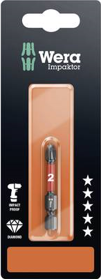 851/4 IMP DC 1 x PH 2x50 Impaktor BitImpaktor-Bit: Überdurchschnittliche Produktlebensdauer durch bestmögliche Ausnutzung der Materialeigenschaften und durch optimal angepasste Geometrien auch bei extremen Anforderungen besonders geeignet für den Einsatz mit handelsüblichen Impakt-/Schlagschraubern die raue Diamantbeschichtung reduziert durch erhöhten Reibungswiderstand das Herausrutschen aus der Schraube.Ausstattung: Diamantbeschichteter Impaktor-Bit . Die Impaktor-Technologie sorgt durch bestmögliche Ausnutzung der Materialeigenschaften und durch optimal angepasste Geometrien für überdurchschnittliche Standzeiten auch bei extremen Anforderungen. Besonders geeignet für den Einsatz mit handelsüblichen Impakt-/Schlagschraubern. Die raue Diamantbeschichtung der Bits reduziert durch erhöhten Reibungswiderstand das Herausrutschen aus der Schraube. Die winzigen Diamantpartikel beißen sich beim Schrauben förmlich in der Schraube fest. Dadurch ist weniger Anpressdruck notwendig, was die Ermüdung beim maschinellen Verschrauben deutlich verzögert.Technische Daten: Abtrieb: Kreuzschlitz PhillipsAntrieb (Schraubendreher): 1/4\"\" (6.3 mm)Bit-Typ (Kategorisierung): Kreuzschlitz-BitBits-Besonderheiten: Impaktor-TechnologieForm (Bits): F 6.3Gewicht: 13.4 gGröße: PH 2Material (LOV): WerkzeugstahlMaterial-Eigenschaft: legiert, diamantbeschichtetProduktabmessung, Länge: 50 mmLieferumfang: 851/4 IMP DC 1 x PH 2x50