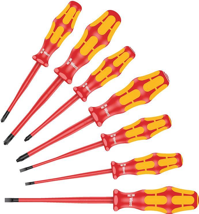 7 Wera VDE iSS-Schraubendreher mit reduziertem Schaftdurchmesser sowie teilweise schlankerem Griffdesign, um das Arbeiten in beengten Arbeitssituationen zu ermöglichen und tief liegende Schraub- und Federelemente erreichen und betätigen zu können; einzeln geprüfte Werkzeuge nach IEC 60900; Einzelprüfung im Wasserbad bei 10.000 Volt, um ein sicheres Arbeiten bei der zulässigen Spannung von 1.000 Volt zu gewährleisten. "Take it easy" Tool Finder: Farbcodierung nach Profil und Größe. Die Anti-Roll-Funktion verhindert ein lästiges Wegrollen am Arbeitsplatz.