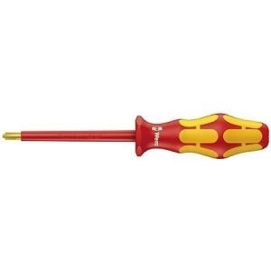 162i PH/S # 1 x 80 mm VDE-Schraub.-Dreh. Wera VDE-Schraubendreher mit mehrkomponentigem Kraftform-Griff für schnelles und schonendes Arbeiten. Stückgeprüft bei 10.000 Volt. Sechskantabrollschutz gegen lästiges Wegrollen. PlusMinus Profil = Profilkombination aus Phillips und Schlitz, unerlässlich für den Einsatz bei Reihenklemmen, Sicherungskästen. Schaltern, Relais etc.Ausstattung: Kraftform Plus Schraubendreher bringen höhere Kraftübertragung bei geringer Anstrengung und schonen das gesamte Hand-Arm-System – auch im Dauereinsatz. Dazu kommt bei der Serie 100 VDE der Sicherheitsgedanke, der bei Wera an oberster Stelle steht. Die Qualität der Klingen übertrifft in Bezug auf Härte und Drehmomentfestigkeit die bekannten Normen. Die Sicherheit bei Arbeiten bis 1.000 Volt wird durch die Stückprüfung jedes einzelnen Werkzeugs auf Durchschlagfestigkeit bei 10.000 Volt gewährleistet. Durch die hervorragend an die Hand angepasste Form des Kraftform-Griffs werden Handverletzungen wie Blasen und Schwielen vermieden. Die für den Griff verwendeten harten Materialien (rote Griffzonen) garantieren schnelles Umgreifen ohne die Gefahr des \"\"Festklebens\"\" der Haut am Griff. Die weicheren, \"\"rutschfesten\"\" Zonen (gelb) ermöglichen die verlustfreie Übertragung hoher Kräfte. Auch bei extremen Einsatzbedingungen ist durch die geprüfte Kaltschlagfestigkeit bei -40 °C die Sicherheit gewährleistet.Die Kennzeichnung des Griffs mit Schraubensymbol und Profilgröße erleichtert das Auffinden des Schraubendrehers in der Werkzeugtasche und am Arbeitsplatz. Der Sechskantabrollschutz verhindert lästiges Wegrollen am Arbeitsplatz.Technische Daten: Abtrieb: Plus/MinusAnwendungsbereich (Schraubendreher): VDEDIN-Norm (Schraubendreher): DIN EN 60900EN-Norm (Schraubendreher): EN 60900Gewicht: 56 gGriff-Durchmesser: 33 mmGrifflänge: 98 mmGröße: SL/PH 1Klingen-Ausführung: RundklingeKlingenlänge: 80 mmMaterial (LOV): WerkzeugstahlMaterial-Eigenschaft: legiert,vernickeltProduktabmessung, Länge: 178 mmSchraubendreher-Art (Kategorisierung): Plus/minus-SchraubendreherSchraubendreher-Besonderheiten: MehrkomponentengriffLieferumfang: 162i PH/S # 1 x 80 mm
