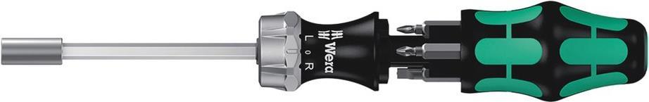Wera Kompaktwerkzeug mit mehrkomponentigem Kraftform Griff für hohe Arbeitsgeschwindigkeiten und besonders ergonomisches Verschrauben. Integriertes Bit-Magazin im Griff. Inkl. Ratsche: Feinverzahnung für geringen Rückholwinkel, Umschaltring (rechts, fest, links), maximales Drehmoment von bis zu 50 Newtonmetern; Sechskant-Klinge mit 1/4"-Innensechskantaufnahme, Edelstahlhülse, starker Dauermagnet.
