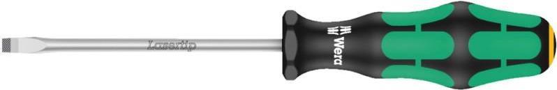 334 0,8 x 5,0 x 100 mm Schlitz-Schr.-Dr.Hochwertiger Kraftform Plus Schraubendreher von Wera. Mehrkomponentiger Kraftform Griff. Lasertip-Spitzen: Microraue Oberfläche, die sich im Schraubenkopf festbeisst. Dadurch weniger Ausrutscher, weniger Aufpressdruck notwendig. Mit Sechskantabrollschutz gegen Wegrollen. Mit Griffkennzeichnung zum leichteren Finden und Sortieren des Werkzeugs.Ausstattung: Kraftform Plus Schraubendreher bringen höhere Kraftübertragung bei geringer Anstrengung und schonen das gesamte Hand-Arm-System – auch im Dauereinsatz. Durch die hervorragend an die Hand angepasste Form des Kraftform-Griffs werden Handverletzungen wie Blasen und Schwielen vermieden. Die für den Griff verwendeten harten Materialien (schwarze Griffzonen) garantieren schnelles Umgreifen ohne die Gefahr des \"\"Festklebens\"\" der Haut am Griff. Die weicheren, \"\"rutschfesten\"\" Zonen (grün) ermöglichen die verlustfreie Übertragung hoher Kräfte. Die Kennzeichnung des Griffs mit Schraubensymbol und Profilgröße erleichtert das Auffinden des Schraubendrehers in der Werkzeugtasche und am Arbeitsplatz. Der Sechskantabrollschutz verhindert lästiges Wegrollen am Arbeitsplatz.- Wie kann ich das Herausrutschen aus dem Schraubenkopf verhindern?Immer wieder passiert es, dass man beim Verschrauben aus der Schraube rutscht. Manchmal kann man dabei möglicherweise sogar in unter Spannung stehende Bauteile abrutschen. Die Spitze von Wera Lasertip-Schraubendrehern wird mit Laserstrahlen mikroskopisch fein aufgeraut. Diese raue Oberfläche \"\"beißt\"\" sich förmlich im Schraubenkopf fest. Dies vermittelt ein sicheres Gefühl, gerade wenn unter Spannung gearbeitet wird.Durch Laserbehandlung wird auf die Klingenspitze eine microraue Oberfläche mit Randhärten von bis zu 1000 Vickers eingebrannt. Sie beißt sich förmlich im Schraubenkopf fest. Der Vorteil: weniger Ausrutscher, höhere Sicherheit.Die Schraubendrehersätze werden immer mit Rack geliefert, das an der Wand befestigt werden kann. So ist ordentliche Aufbewahrung und schneller Zugriff gewährleistet.Technische Daten: Abtrieb: SchlitzAnwendungsbereich (Schraubendreher): WerkstattGrifflänge: 98 mmKlingen-Ausführung: RundklingeKlingen-Durchmesser: 5 mmKlingenbreite: 5 mmKlingendicke: 0.8 mmKlingenlänge: 100 mmMaterial (LOV): WerkzeugstahlMaterial-Eigenschaft: legiertProduktabmessung, Länge: 198 mmSchraubendreher-Art (Kategorisierung): Schlitz-SchraubendreherSchraubendreher-Besonderheiten: MehrkomponentengriffLieferumfang: 334 0,8 x 5,0 x 100 mm