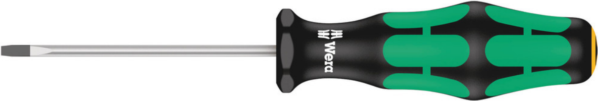 335 0,6 x 3,5 x 125 mm Schlitz-Schr.-Dr.Hochwertiger Kraftform Plus Schraubendreher von Wera. Mehrkomponentiger Kraftform Griff. Lasertip-Spitzen: Microraue Oberfläche, die sich im Schraubenkopf festbeisst. Dadurch weniger Ausrutscher, weniger Aufpressdruck notwendig. Mit Sechskantabrollschutz gegen Wegrollen. Mit Griffkennzeichnung zum leichteren Finden und Sortieren des Werkzeugs.Ausstattung: Kraftform Plus Schraubendreher bringen höhere Kraftübertragung bei geringer Anstrengung und schonen das gesamte Hand-Arm-System – auch im Dauereinsatz. Durch die hervorragend an die Hand angepasste Form des Kraftform-Griffs werden Handverletzungen wie Blasen und Schwielen vermieden. Die für den Griff verwendeten harten Materialien (schwarze Griffzonen) garantieren schnelles Umgreifen ohne die Gefahr des \"\"Festklebens\"\" der Haut am Griff. Die weicheren, \"\"rutschfesten\"\" Zonen (grün) ermöglichen die verlustfreie Übertragung hoher Kräfte. Die Kennzeichnung des Griffs mit Schraubensymbol und Profilgröße erleichtert das Auffinden des Schraubendrehers in der Werkzeugtasche und am Arbeitsplatz. Der Sechskantabrollschutz verhindert lästiges Wegrollen am Arbeitsplatz.- Wie kann ich das Herausrutschen aus dem Schraubenkopf verhindern?Immer wieder passiert es, dass man beim Verschrauben aus der Schraube rutscht. Manchmal kann man dabei möglicherweise sogar in unter Spannung stehende Bauteile abrutschen. Die Spitze von Wera Lasertip-Schraubendrehern wird mit Laserstrahlen mikroskopisch fein aufgeraut. Diese raue Oberfläche \"\"beißt\"\" sich förmlich im Schraubenkopf fest. Dies vermittelt ein sicheres Gefühl, gerade wenn unter Spannung gearbeitet wird.Durch Laserbehandlung wird auf die Klingenspitze eine microraue Oberfläche mit Randhärten von bis zu 1000 Vickers eingebrannt. Sie beißt sich förmlich im Schraubenkopf fest. Der Vorteil: weniger Ausrutscher, höhere Sicherheit.Die Schraubendrehersätze werden immer mit Rack geliefert, das an der Wand befestigt werden kann. So ist ordentliche Aufbewahrung und schneller Zugriff gewährleistet.Technische Daten: Abtrieb: SchlitzAnwendungsbereich (Schraubendreher): WerkstattGrifflänge: 81 mmKlingen-Ausführung: RundklingeKlingen-Durchmesser: 3.5 mmKlingenbreite: 3.5 mmKlingendicke: 0.6 mmKlingenlänge: 125 mmMaterial (LOV): WerkzeugstahlMaterial-Eigenschaft: legiertProduktabmessung, Länge: 206 mmSchraubendreher-Art (Kategorisierung): Schlitz-SchraubendreherSchraubendreher-Besonderheiten: MehrkomponentengriffLieferumfang: 335 0,6 x 3,5 x 125 mm