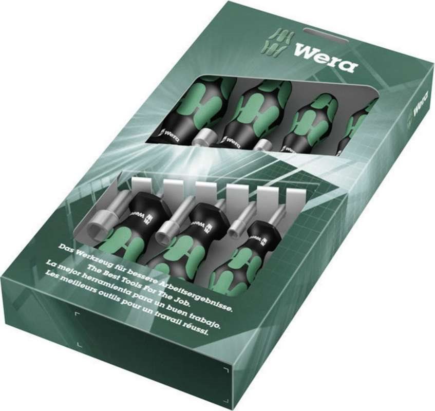 7-teiliger Mutternsprenger-Satz von Wera. Hohlschaft für die Befestigung von Gewindestangen; erst dann kann die Gewindestange mit Mutter in den Hohlschaft rutschen. Mehrkomponentiger Kraftform-Griff für hohe Arbeitsgeschwindigkeiten und besonders ergonomisches Schrauben. Sechskant-Rollsicherung verhindert ein Wegrollen und Griffmarkierungen erleichtern das Auffinden und Sortieren des Werkzeugs; für Sechskantschrauben.Produkttext[/head]7-teiliger Steckschlüssel-Schraubendrehersatz von Wera. Hohlschaft zur bei Gewindestangen, denn nur dann kann dieGewindestange durch die Schraubenmutter in den hohlen Schaft des Schraubendrehers eindringen. Mehrkomponentiger Kraftform Griff für hoheArbeitsgeschwindigkeiten und besonders ergonomisches Verschrauben. Mit Sechskantabrollschutz gegen Wegrollen. Mit Griffkennzeichnung zumleichteren Finden und Sortieren des Werkzeugs. Für Außensechskantschrauben.[head]Hauptmerkmale
