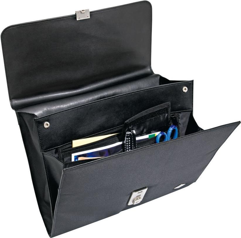 WEDO Orgamappe "Elegance" mit praktischem Tragegriff. Durch das oben und unten offene Einsteckfach für einen A4-Schreibblock ist diese multifunktionale Mappe auch für Linkshänder geeignet. Die auf einem Einschubrücken befestigte 4-Ring-Mechanik (Ø 35 mm, Füllhöhe 24 mm) ist herausnehmbar. Weitere Ausstattung innen: ein großes A4-Einsteckfach, ein Reißverschlussfach, drei Stiftschlaufen, drei Kartenfächer sowie drei unterschiedlich breite Gummizugschlaufen. Die Orgamappe ist aus einer Kombination von hochwertigem Kunstleder und strukturiertem Nylon gefertigt. Sie wird mit einem Reißverschluss verschlossen und ist auf beiden Außenseiten mit einem A4-Einsteckfach ausgestattet. Der praktische Tragegriff erlaubt einen einfachen Transport.