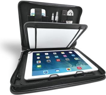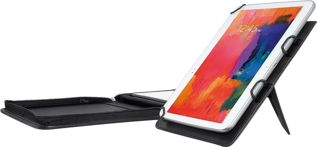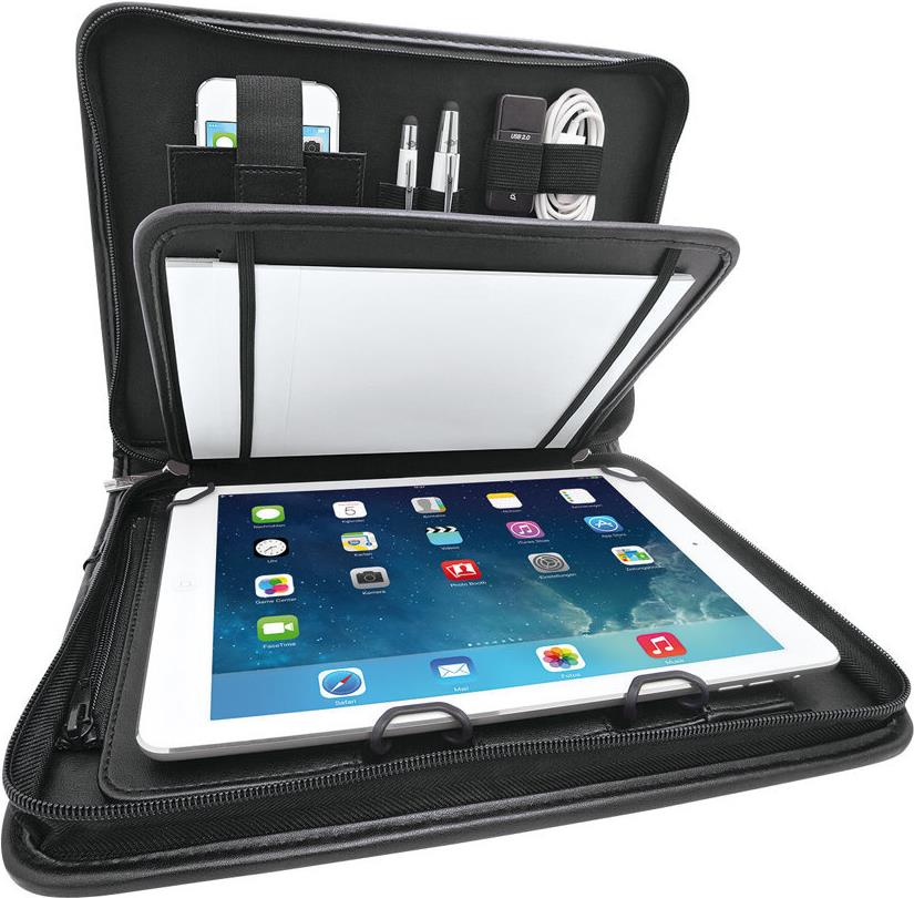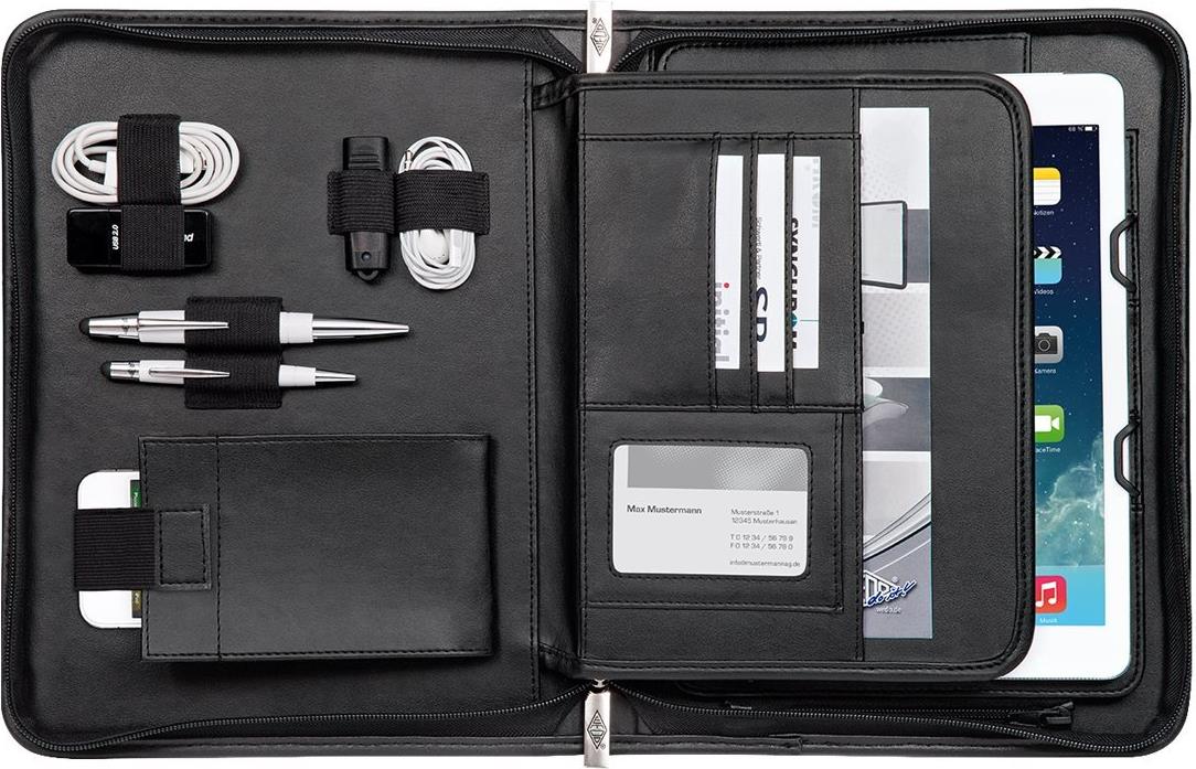 Der flexible Halterungsmechanismus fixiert alle Tablets mit einer Länge von 240–266 mm und einer Breite von 170–186 mm sicher und fest. Der Materialmix aus hochwertigem Kunstleder und strukturiertem Nylon verleiht dem Organizer eine elegante Optik und macht ihn durch die praktische, multifunktionale Ausstattung zum idealen Begleiter im modernen Business.