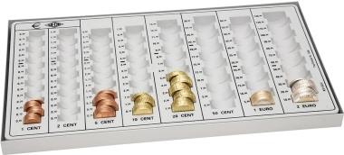 EDO Hartgeld-Zählbrett (EURO) aus Polystyrol, eingefaßt in einem Metallrahmen aus Stahlblech mit kratzfester Pulverlackierung. Unentbehrlich für alle die viel mit Münzgeld zu tun haben. Die Münzräume gewährleisten einen leicht abzulesenden Kassenbestand und halten Ordnung in der Schublade.