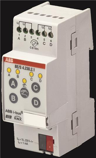 Das Gerät erfasst vier AC/DC-Signale im Spannungsbereich von 10...230 V. Der Eingangszustand wird über 4 gelbe LED’s angezeigt. Die Binäreingänge ermöglichen die Erfassung von insgesamt 4 Eingangssignalen (in 2 Gruppen). Pro Kanal verfügen die Geräte über eine Taste zur Handbedienung. Die Geräte werden über den ABB i-bus® versorgt und benötigen keine zusätzliche Stromversorgung.