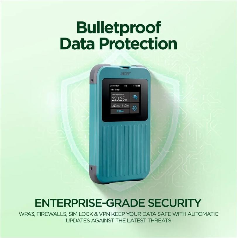 Der Acer Connect M4 wurde für mobile Konnektivität entwickelt und verfügt über einen Lithium-Ionen-Akku mit einer Kapazität von 8000 mAh, damit Sie auch unterwegs immer mit Strom versorgt sind. Ausgestattet mit einem 2,4-Zoll-Touchscreen-Display und 8 GB Flash-Speicher bietet er eine intuitive Benutzererfahrung und erleichtert den Zugriff auf Ihre Daten. Das Gerät entspricht den Normen IP68 und MIL-STD-810H und gewährleistet somit Langlebigkeit in verschiedenen Umgebungen, was es zu einem idealen Begleiter für Arbeit und Freizeit macht. Dieser mobile Hotspot unterstützt mehrere Mobilfunkprotokolle, darunter 5G NR, LTE und 4G LTE, und ermöglicht so die Konnektivität über verschiedene Netzwerke hinweg. Mit der Möglichkeit, bis zu 16 WiFi-Geräte gleichzeitig zu verbinden, verbessert das Connect M4 Ihr Netzwerkerlebnis. Darüber hinaus unterstützt er Dual-SIM-Funktionen, einschließlich eSIM, und bietet so flexible Verbindungsoptionen. Der im Lieferumfang enthaltene globale 1-GB-Datentarif sorgt dafür, dass Sie überall auf Reisen in Verbindung bleiben.