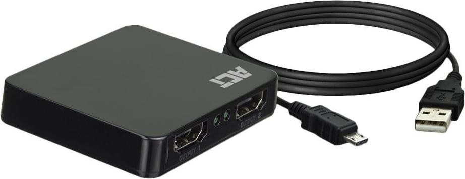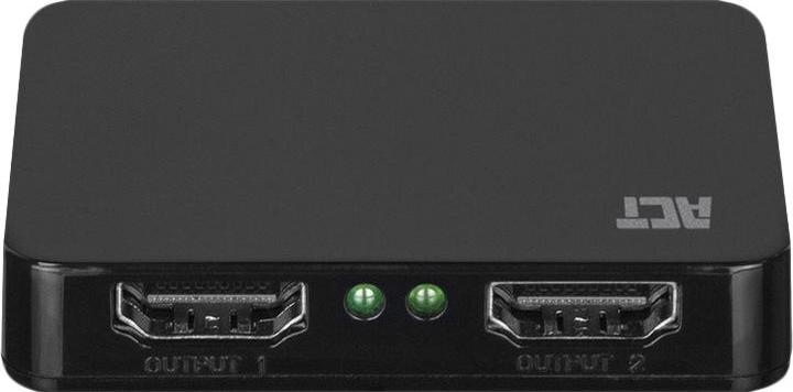 Der 4K-HDMI-Splitter ACT AC7845 teilt ein einzelnes HDMI-Signal auf zwei separate Fernsehgeräte oder Bildschirme auf. Bei Anschluss per Highspeed-HDMI-Kabel liefert der AC7845 maximal eine 4K-Auflösung von 3840 × 2160 Pixeln bei 30 Hz sowie eine 3D-Auflösung von 1080p bei 60 Hz. Ein USB-Stromversorgungskabel ist beim AC7845 gleich mit dabei.
