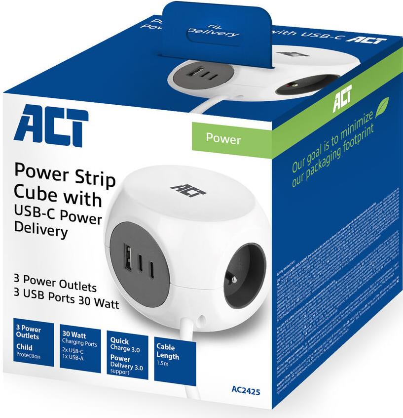 Mit dem AC2425 Power Strip Cube können Sie drei elektrische Geräte und drei USB-Geräte gleichzeitig anschließen. Die USB-Anschlüsse (2x USB-C / 1x USB-A) bieten eine Gesamtleistung von 30 W und sind gegen Überspannung ...