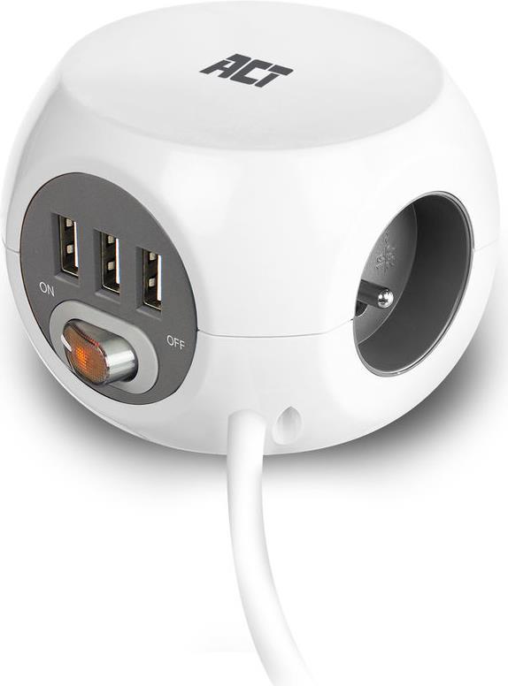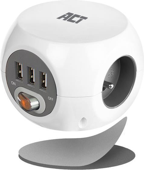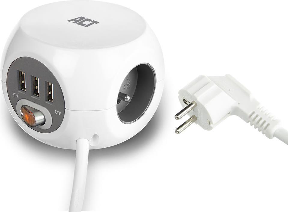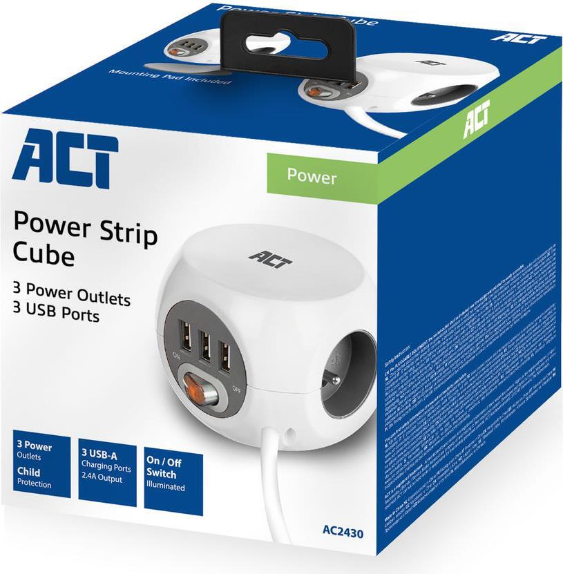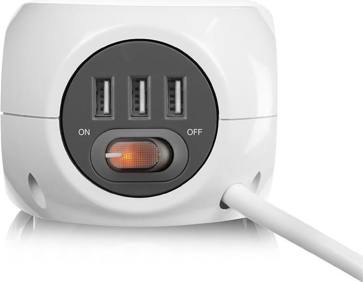 Die Würfelsteckdose AC2430 hat 3 Steckdosen zum Anschluss von 3 Geräten. Die drei USB-Anschlüsse eignen sich zum gleichzeitigen Laden von Smartphones und Tablets mit einer maximalen Belastung von 2,4A.