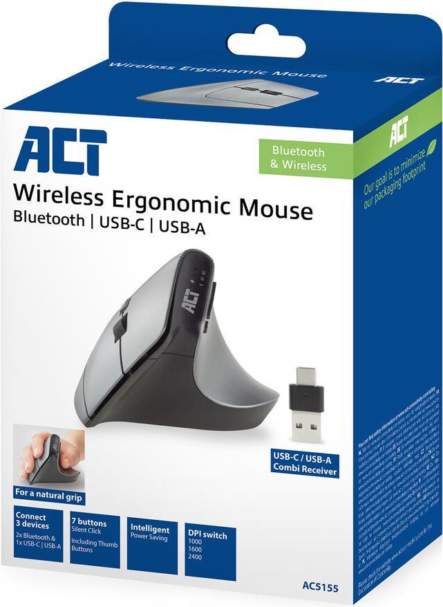 Verhindern Sie mausbedingte Überlastungsschäden mit der ACT AC5155 Wireless Ergonomic Mouse. Verbinden Sie diese Maus über Bluetooth (2x) und den USB-C/USB-A-Kombi-Empfänger (1x) mit drei verschiedenen Geräten ...
