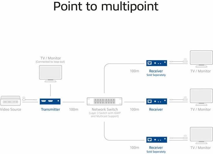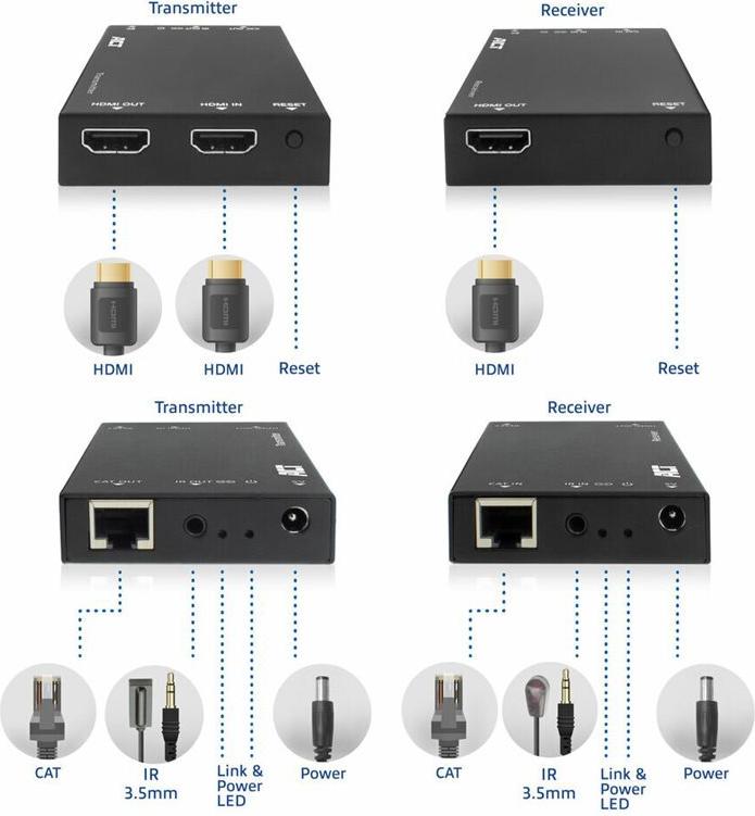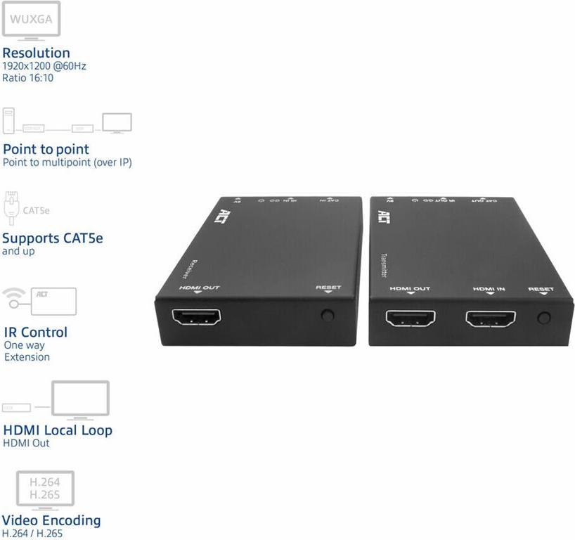 Mit dem HDMI-over-IP-Extender-Set AC7852 können Sie ein HDMI-Signal über CAT5e und höher über eine Entfernung von bis zu 150 Metern (Punkt-zu-Punkt) verlängern. Sie können bis zu 253 Empfänger in einer Punkt-zu-Mehrpunkt-Einstellung anschließen. Die Sendeeinheit verfügt über einen HDMI-Ausgang zum Anschluss eines lokalen Displays. Ein Infrarotsender und -empfänger sind enthalten, um das Quellgerät mit seiner Standardfernbedienung zu steuern. Der AC7852 unterstützt eine Auflösung von 1920 x 1200 bei 60 Hz mit einem Seitenverhältnis von 16:10, EDID-Kopie, Chroma Sampling 4:4:4, Videocodierung H.265 und HDCP 1.4. Das Extender-Set wird mit Montagehalterungen geliefert.